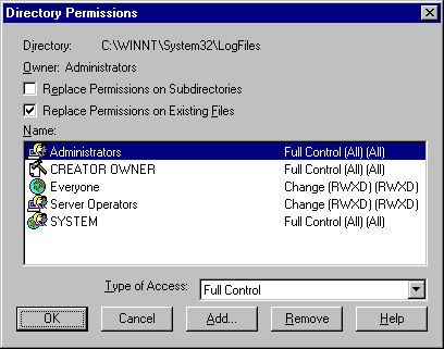 Now, look at the permissions for the log file directory. Does the web server user account already have Change (or Full Control) permissions? Alternately, does the Everyone account have Change (or Full Control) permissions? If not, then you need to add Change permissions for the web server user account.